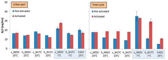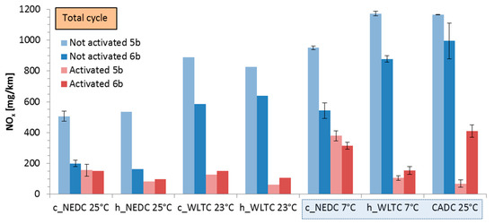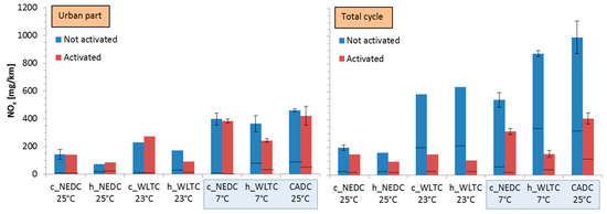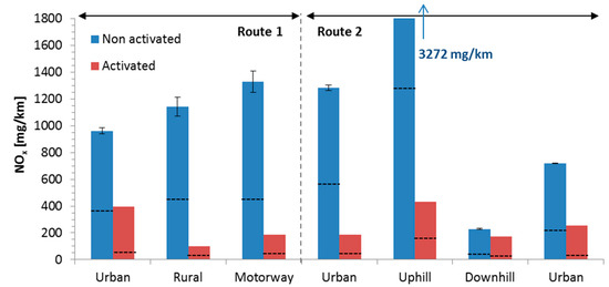 In order to estimate what would be the mean NOx reduction in cities, one would have to calculate mean trip distances between cold starts. According to a summary report [30], the median distance between two consecutive cold starts is 30 ± 13 km or 27 ± 8 km if only urban trips are considered. Thus, the expected NOx reduction impact of the retrofit solution in cities is similar to the reduction measured at the urban part (which is around 33 km) of the RDE (59%, see Figure 5, Urban, first bars). The absolute reduction and environmental effect in terms of mass of NOx would be substantial.
