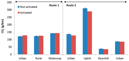 Figure 4 summarizes the CO2 on-road results over the two performed routes. The emissions ranged from <50 g/km (driving downhill) to around 300 g/km (driving uphill). The activation of the retrofit has slight influence on the CO2 emissions (+7 g/km) only in the urban part with cold engine start, probably due to heating of the cartridges for ammonia release or the lower ambient temperature of the specific test. The on-road test (both routes) with the retrofit activated was the only test with ambient temperature around 0 °C (instead of 6 °C, rest of the tests). In any case, the differences of CO2 were very close to the experimental repeatability (±4 g/km).