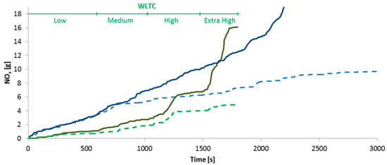 Cumulative NOx emissions for the 1800 seconds of the cold start WLTC tests at 23 °C (green lines) and the first 3000 seconds of real-driving emissions (RDE) tests at approximately 6 °C (urban part) (blue lines). The WLTC phases are also indicated. Dashed lines: retrofit activated. Solid lines: retrofit not activated.