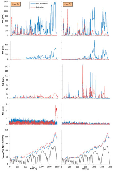 The lower NOx reduction of the Euro 6b compared to the Euro 5b is counter-intuitive as combinations of LNT with SCR have shown better NOx reduction efficiencies than SCR alone [15]. In order to gain a better insight of these results Figure 8 presents NOx, NO2, N2O and NH3 of a WLTC at 23 °C with cold start for the two vehicles (Euro 5b and Euro 6b) with the retrofit activated or not. The speed profile and the exhaust gas temperature at the tailpipe are given at the lowest panel. The NOx emissions with the retrofit activated are lower for the Euro 6b vehicle; this could be due to better engine calibration or EGR use (Figure 8, upper panel). With the retrofit activated the NOx reduction starts later for the Euro 6b vehicle and the absolute NOx emissions are also higher than the Euro 5b vehicle, which means that the performance of the retrofit was better with the Euro 5b vehicle for exactly the same test. The NO2 emissions increase after the middle of the cycle as the temperature at the DOC increases (middle panel), probably to support the DPF regeneration at lower temperatures. The NO2 and N2O emissions are higher at the Euro 6b vehicle, probably due to the LNT [37] that could also explain the N2O spikes of the Euro 6b vehicle. The NO2 concentration is reduced efficiently (middle panel) because the SCR has the appropriate temperature and the presence of NO2 enhances the SCR activity at lower temperatures [38]. However, some N2O is produced at high speed accelerations due to the higher production of N2O from NO2 or NH3 at high temperatures [15,26] and/or due to NH3 overdosing [39]. This is more evident at the end of the cycle for the Euro 5b vehicle where a significant increase of N2O and NH3 are seen.