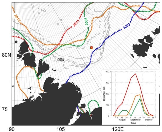 | Year | Date-1 | Date-2 | Lat., ° | Long., ° | Date of Opening, ±5 Days | Date of Closing, ±5 Days | Duration of Open Water, ±10 Days | Mean Distance to the Ice Edge, km |