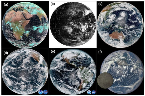 Earth observing geostationary satellite platforms. (a) MSG-3 at 0° longitude (true-colour image). (b) INSAT at 82° E longitude (single band visible). (c) Himawari-8 at 140° E longitude (true-colour image). (d) GOES-17 at 137.2° W longitude (true-colour image). (e) GOES-16 at 0° longitude (true-colour image). (f) EPIC/DSCOVR at the L1 lagrange point (true-colour) also showing the far side of the moon during a transit. Data courtesy of the meteorological agencies: Eumetsat (EU), NMSC (Government of India), JMA/JAXA (Japan), NASA and NOAA (USA).