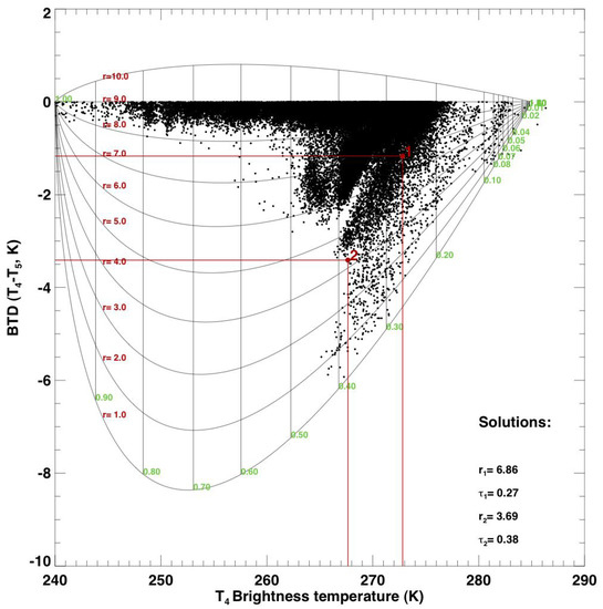 where is the absorption coefficient of the particles at wavelength i and z is the geometric thickness of the cloud, = , = −, and = −. The important physics is captured in the parameter , the ratio of extinction coefficients at two wavelengths, and . It is possible to explore the parameter range of , guided by typical values for the extinction coefficients. Since the two wavelengths are usually close together the extinction coefficients are not very different and 1. When , the extinction coefficient at , which leads to a “U-shaped” curve, while for the opposite case an “arch-shaped” curve results. If then has no variation with and no information can be retrieved from this analysis. It turns out that for ≈ 11 m and ≈ 12 m, typical of channels on many satellite sensors, for silicates (ash particles) and for water molecules and ice particles. If one were free to design a sensor solely for ash detection, it would be sensible to select channels that optimise the “U-shaped” curve.