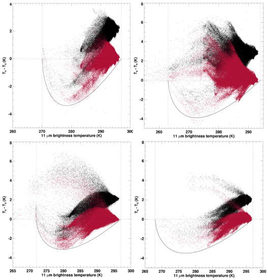 Temperature difference distributions without (black dots) and with (red dots) a water vapour correction for four different volcanic clouds using AVHRR data. and are AVHRR channel 4 (11 m) and 5 (12 m) brightness temperatures and correspond to and nomenclature used here.