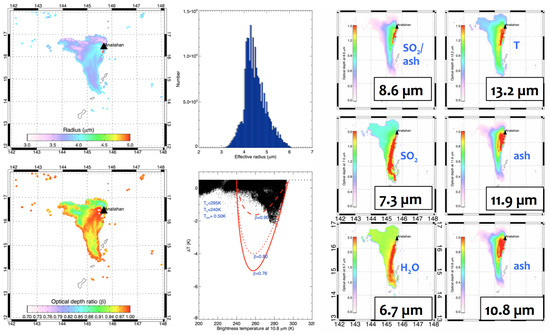 Retrieval schemes [31,34] include a microphysical model of the ash particles with a detailed radiative transfer model, to invert the infrared data to reveal an effective particle size, cloud opacity and mass loading. When these parameters are integrated over the area covered by the cloud, the total mass can be inferred from the data. These are quantifiable products that may be incorporated with dispersion models to generate risk maps for use by the aviation industry. An example of this kind of retrieval is given in Figure 6, for the June, 2011 eruption of Puyehue–Cordón Caulle southern Chile.