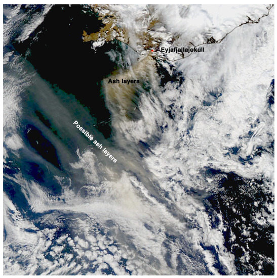 - Winker, D.; Liu, Z.; Omar, A.; Tackett, J.; Fairlie, D. CALIOP observations of the transport of ash from the Eyjafjallajökull volcano in April 2010. J. Geophys. Res. Atmos. 2012, 117. [Google Scholar] [CrossRef]