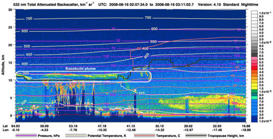 - Prata, A.T.; Young, S.A.; Siems, S.T.; Manton, M.J. Lidar ratios of stratospheric volcanic ash and sulfate aerosols retrieved from CALIOP measurements. Atmos. Chem. Phys. 2017, 17, 8599–8618. [Google Scholar] [CrossRef]
