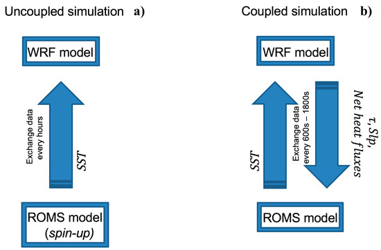 Sketch of different model configurations: (a) uncoupled approach where the sea surface temperature (SST), updated every hour, is used as a lower boundary in the WRF (weather research and forecasting) model; (b) coupled approach with ocean and atmosphere models exchanging energy and momentum fluxes (data exchange may occur at different intervals, i.e., every 600 s and 1800 s).