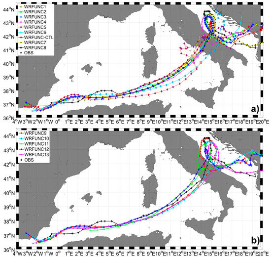 Observing the trajectory followed by runs with different PBL schemes (Figure 4b), one can see that, in the first part of the event, when the MTLC moves over the western Mediterranean sea, the differences among the simulated paths and the observed trajectory increase with the time spent over the sea (as in [22]). This suggests that the interaction between the PBL and the sea surface needs some time to settle before influencing higher levels; in fact, in this tropical-like cyclone (TLC) phase (from 1 to 36 h), all simulations show a similar path with geometric distances from the observed track ranging on average between 26 and 30 km. However, before landfall the WRFUNC11 (QNSE scheme, [43]) and the WRFUNC12 runs (MYNN2 scheme, [44]) generate a northward shift of about 110 and 150 km, compare to observations.