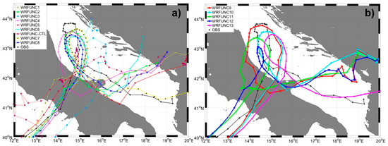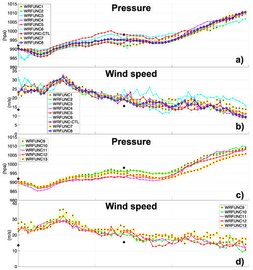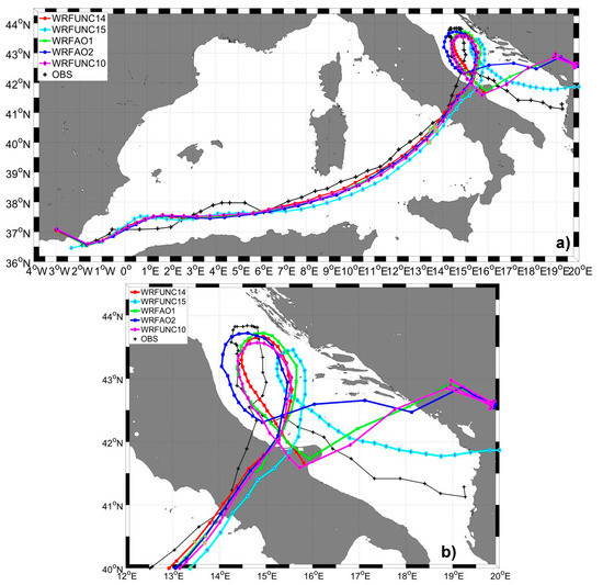 After landfall near Napoli, the MTLC moved inland and in this phase did not show tropical characteristics [6]. The second tropical transition occurred during its transit over the Adriatic Sea (Figure 1a), where first it moved northward and then south-southeastward. At this stage, several runs (WRFUNC2-4-6-7-8) describe accurately the track of the cyclone (Figure 5a). However, the final part of the cyclone is reproduced well only in WRFUNC7 (Figure 5a); in fact, the final and weakest stages in the cyclone lifetime are generally less predictable in terms of track and minimum pressure [15].