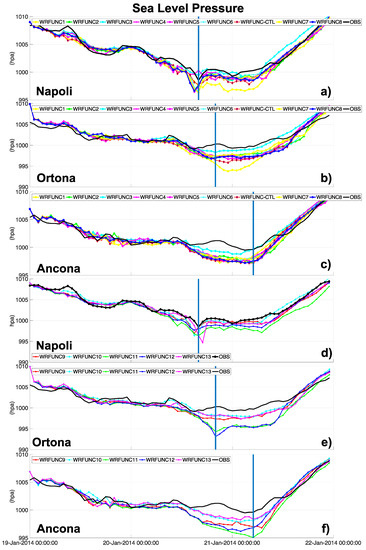 The simulations WRFUNC10 and WRFUNC13 also show a more realistic intensity in the two Adriatic stations (Ancona and Ortona), with a bias of about 2 hPa compared to the other schemes, which overestimate the cyclone depth by about 5 hPa (Figure 6). Similar results are obtained in the timeseries in Figure 8, where the WRFUNC11 and WRFUNC12 runs overestimate the pressure depth by several hPa.