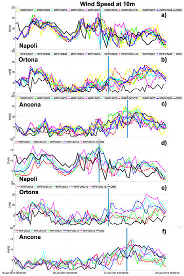 As in Figure 6 but for the wind speed for all uncoupled simulations. (a–c) data with different microphysics schemes; (d–f) data with PBL parameterizations. The blue lines indicate the landfall time over the Napoli station (a–d) and the time when the cyclone arrives close to the other stations, Ortona and Ancona.