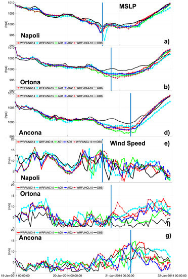 Observed and simulated MSLP (a–c) and wind speed (e–g) in Napoli, Ortona, and Ancona weather stations (WRFUNC10-14-15, AO1, and AO2 runs). The blue lines indicate the landfall time near the Napoli station (a–d) and the time when the cyclone arrives near the other stations, Ortona and Ancona.