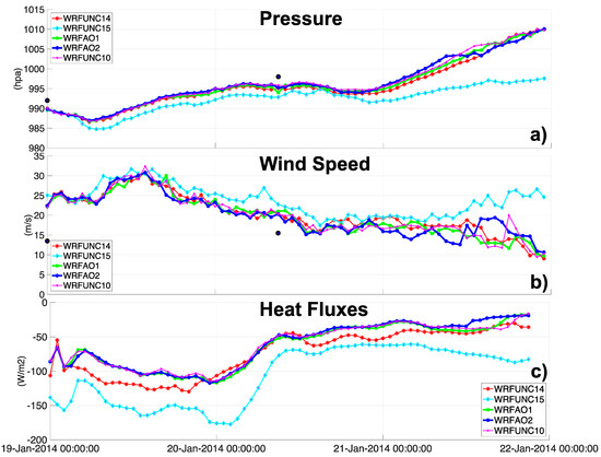 Greater sea surface fluxes, like those simulated in WRFUNC14 and WRFUNC15, provide more energy to the cyclone. However, they do not affect its intensity immediately; they require a time period during which the cumulative effects of air–sea interaction processes become effective (as in Figure 4 in [9]). For example, as shown in Figure 11c, while the WRFUNC15 simulation generates more intense heat fluxes than the other runs over the whole simulation length, the difference in terms of wind and pressure fields increases significantly only near the end of the runs.