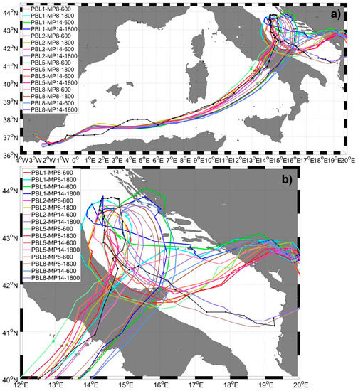 MTLC simulated trajectories over the full domain (a) and zoom of trajectories over the last part of the track (b) in the coupled simulations that use a different PBL, a different microphysics scheme, and a different coupling time.