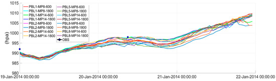 After the landfall in Napoli, one may note a rapidly growing divergence among the trajectories (Figure 12b): the PBL1 and PBL2 schemes produce tracks closer to the observed one, PBL5 generates trajectories shifted toward the Italian Adriatic coast and a slower evolution, and PBL8 generates trajectories shifted to the east. Figure 13 shows a spread of almost 5 hPa among the runs in the phase of the maximum strength of the cyclone. The simulations using the schemes PBL1 and PBL2 show the best results with a difference from observations of only 1 hPa. The choice of the timing of communication slightly affects the development of the MTLC, which is slightly more intense for the smallest exchange time.
