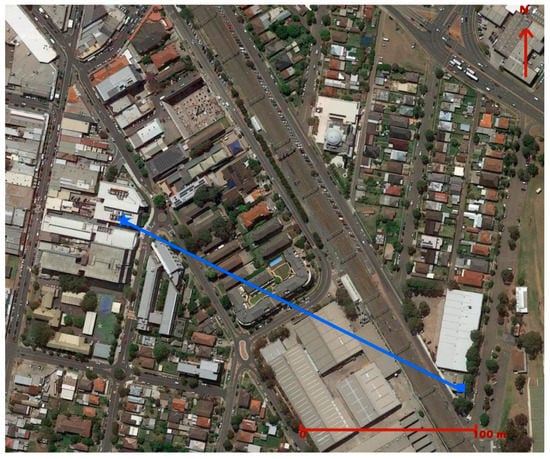 ) on roof of 3 story building at the edge of the small business district in Auburn is located. The measurement path (395 m) is marked (-). There is a major intersection in the north-east. To the east is light industrial area, with mainly residential to the east. The measurement path crosses a railway line and a major intra-urban motorway is to the east (not shown on the map).