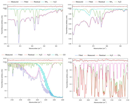 Shows examples of the fit of the modelled synthetic spectrum to the measured spectrum and the resulting rms residual for: top left panels NH3 in the 900 micro-window and right panel in the 955 cm−1 micro-windows; lower left panel CO2 N2O and CO in the 2300 cm−1 micro-window; and lower right panel CH4 in the 3000 cm−1 micro-window.