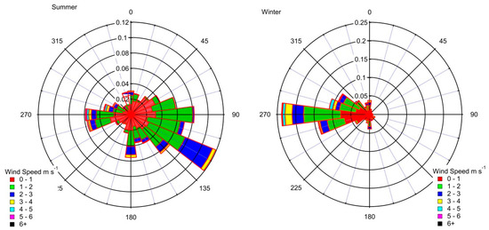 Wind direction and speed measured at the site on the roof of the building from October 2016 to March 2017 (summer) and May 2017 to September 2017 (winter).