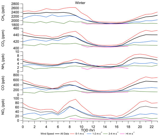 The variation in CH4 (ppbv), CO2 (ppbv), NH3 (ppbv), CO (ppbv) and NOx (ppbv) with the hour-of-day and binned to wind speeds 0–1 m s−1, 1–2 m s−1, 2–4 m s−1, >4 m s−1 and averaged for all wind speeds (winter). CH4, CO2, NH3 and CO were measured by the open-path FTIR, while NOx was measured at the Mobile Air Quality (MAQ) station.