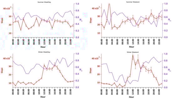 The Slope and r2 value from the regression (WODR) between NH3 and CO varied with the hour-of-day, for weekdays and weekends during summer (top panel) and winter (lower panel).
