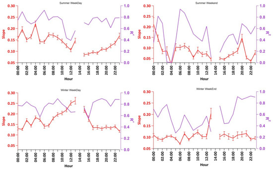 The Slope and r2 value from the regression (WODR) between NOx and CO varied with the hour-of-day, for weekdays and weekends during summer (top panel) and winter (lower panel). Data is missing at 14:00 due to daily instrument calibration.