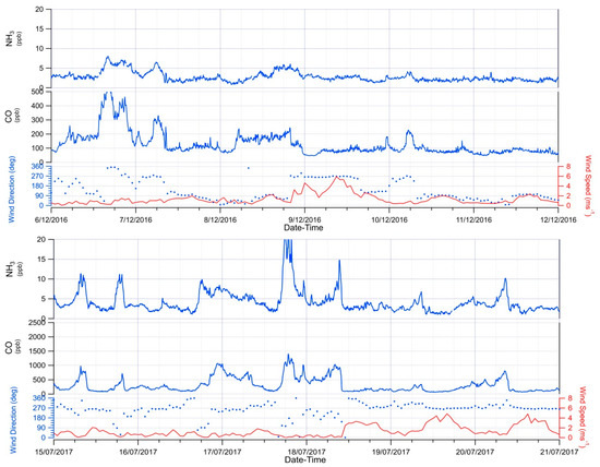 Prior to analysis, data were filtered for wind speed > 0.5 m s−1, to remove data collected under very stable atmospheric conditions. This removes data where the CO and NH3 have been decoupled during transport to the line sensor, as the frequency and characteristics of turbulence cells become more erratic with increasing stability [34,36]. The longer transport times to the sensor can also promotes greater deposition of NH3. This filtering removed 15% of the data during summer, of which nearly 80% was during the night (18:00 to 6:00). In winter 20% of data were removed, with 75% during the night.
