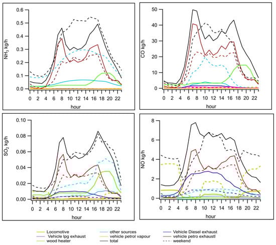 For analysis, data were divided into periods encompassing the morning and afternoon peak traffic, weekend and weekdays and wind direction for the 4 sectors of the compass (northeast 0°–90°; southeast 90–180°; southwest 180–270°; northwest 270–360°; Table 6). As vehicle emissions are highly variable with driving conditions, vehicle fleet and environmental conditions, NH3:CO and NOx:CO were further calculated for each hour-of-day, for weekend and weekday, to capture changes at higher temporal resolution (Figure 6 and Figure 7).