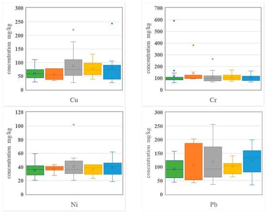Based on the location, the sampling points were classified into functional areas. The urban areas were divided into five main functional areas: residential, commercial, industrial, office, and traffic, with 14 (green), seven (yellow), 11 (red), nine (purple), and 13 (blue) samples in each area (Figure 1). Figure 2 shows the heavy metal concentration in each functional area. Based on a comparison of all areas, the average concentration of the heavy metal Cd in the functional areas has the following order; industrial > traffic > business > office > residential. The order of the average Cr content is commercial > residential > industrial > office > traffic. The order of the average Cu content is industrial > traffic > office > residential > commercial. The order of the average Pb content is traffic > industrial > commercial > office > residential. The order of the average Ni content is industrial > traffic > commercial > office > residential. The order of the average Zn content is traffic > commercial > industrial > office > residential. The overall trend shows that the heavy metal contents in industrial, commercial, and traffic areas are higher than those in the office and residential areas.