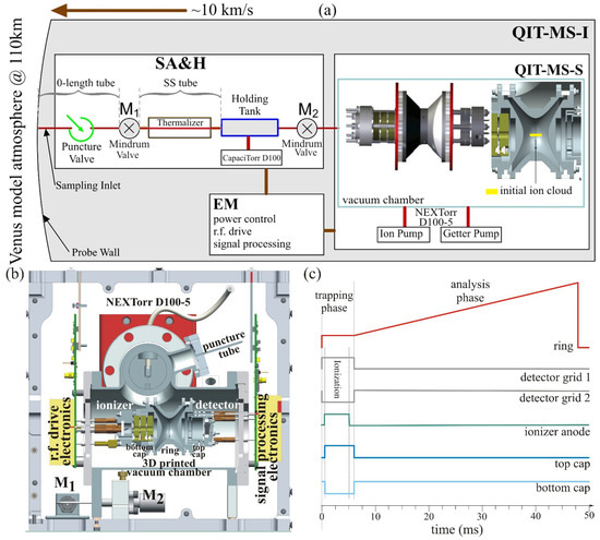 Figure 2, second important input to the SA&H module is the composition of the Venus atmosphere. The time-dependent partial pressures of molecular species entering the QIT-MS-I are derived from the published data on the composition of Venus atmosphere and the simulated probe trajectory, see Equation (1). Note that the total pressure at the inlet of the instrument is a sum of static and dynamic pressures. The static pressure at 110 km is about 0.096 Pa. This value is derived from number densities of Kransopolsky [
