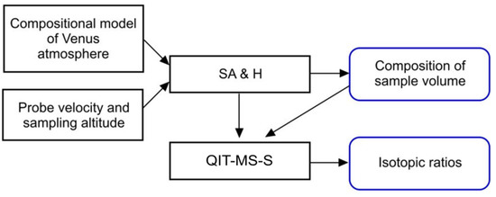 The time-dependent physical properties of atmospheric sample serve as an input to the Sample Acquisition and Handling (SA&H) module. The SA&H module deals with sample thermalization and simulates the non-evaporable getter pump using variable sorption efficiency of chemically-active species. The output of the SA&H module is the composition of the sample volume that depends on already adsorbed chemically-active species. The sample volume is then released into the QITMS-S module. This module simulates the dynamics of gas flow into the vacuum chamber, controls the getter pump adsorbtion dynamics, provides the ion generation, ion confinement, and ion analysis and finally performs the analysis of isotopic ratios.