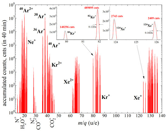 Figure 4 illustrates the part of synthetic mass spectrum accumulated in 40 min of static measurements of noble gas isotopes. Data matrix has been histogrammed in 1 × 10