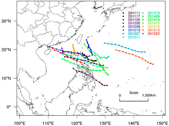 To obtain reasonable optimal scheme combinations for typhoon simulations, 15 typhoon cases from 2011 to 2015 were simulated in this study. All of these typhoons generated over the Northwest Pacific Ocean and passed through the areas of Southeast Asia and the southeast coastal areas of China. Here, only three-day tracks for each typhoon were simulated. The three-day tracks of the 15 typhoons are shown in Figure 1, and the typhoons’ Chinese number ID, name, and simulation period are listed in Table 1. For the three days, all the typhoons only occurred over the ocean and experienced a process of strengthening and weakening. The corresponding typhoon observation dataset was obtained from the China Meteorological Administration (CMA)-Shanghai Typhoon Institute (STI) best track dataset for tropical cyclones over the western North Pacific [31]. It included track (km), central sea level pressure (CSLP, hPa), and 10-m maximum surface wind (10-m wind, m s−1) data.