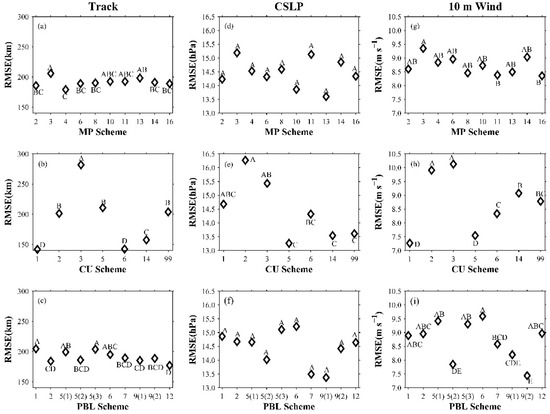 The first round of scheme evaluation results for the (a–c) track, (d–f) central sea level pressure (CSLP), and (g–i) 10 m maximum wind speed (10 m wind) of 15 typhoons using the Tukey’s test method. For each panel, the evaluation of each scheme is obtained based on the scheme combination simulations, including the scheme, and the pairs of schemes sharing at least one letter are not significantly different between their population means; otherwise, they are significantly different. For the significantly different schemes, the order of their population means at the 5% significance level is A > B > C > D > E.