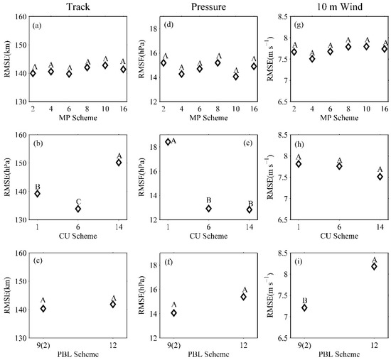 For multi-objective optimization, an MP scheme can only be deleted if it is considered as the worst performing scheme for all optimization variables. The MP scheme 3, assigned the letter “A”, was the common worst MP scheme for the three simulation variables (see Figure 2a,d,g) and should be deleted. However, the MP scheme 13 was only the worst-performing for track and CSLP, but not for 10-m wind, and therefore, could not be deleted at this point. Additionally, if no schemes were significantly different (e.g., Figure 2d), it meant that any of the schemes would produce consistent simulation errors, and therefore, deleting any of the schemes would not affect the accuracy of the ensemble. In a similar way, MP scheme 3, CU 3, and PBL schemes 1, 5(1), 5(3), and 6 were thought to be the common worst performing schemes and were deleted at the end of the first screening.