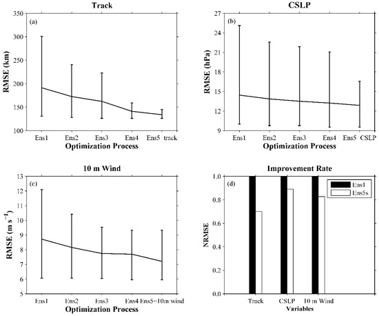 Optimization speed and efficiency for the 15 typhoon simulations of track, CSLP, and 10-m wind. Ens1, Ens2, Ens3, and Ens4 represent the four ensembles. Ens5-track, Ens5-CSLP, and Ens5-10m wind represent the optimal ensemble of track, CSLP, and 10-m wind, respectively. (a–c) represent optimization speeds of the track, CSLP, and 10 m wind simulations, respectively. (d) represents the improvement rate of Ens5s for typhoon simulation compared to Ens1.