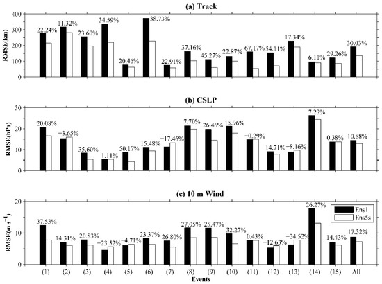 Improvement percentages of the RMSE of Ens5s for the (a) Track, (b) CSLP, and (c) 10-m wind of 15 typhoons, compared to the RMSE of Ens1.