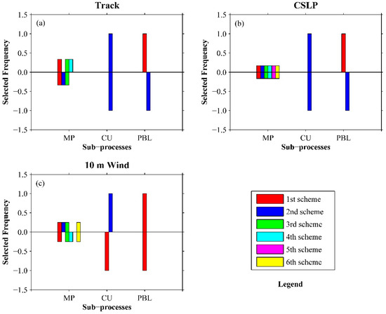 After the third round of screening, 6 MP schemes, 3 CU schemes, and 2 PBL schemes remained (see Table 3). Note that the number of full combinations for the remaining schemes was 36 (6 × 3 × 2). As it was acceptable to run all 36 combination simulations during the four rounds of scheme evaluations, the sampling method was not used and only the Tukey’s test was performed, with the results shown in Figure 3. At this point, no common worst scheme was left to be removed, and therefore, the multi-objective optimization was complete. The results in Figure 3 demonstrate that more than one optimal physics scheme exists for each variable. Therefore, determining a set of optimal scheme combinations for the three variables is difficult to achieve, and each variable has to be treated separately (a single-objective optimization). To achieve this purpose, the optimal ensemble for each variable was quantified, and the optimal scheme combination was determined from the ensemble member simulations. Finally, the optimal ensemble numbers for track, CSLP, and 10-m wind were 12 (6 × 1 × 2), 24 (6 × 2 × 2), and 18 (6 × 3 × 1), respectively.