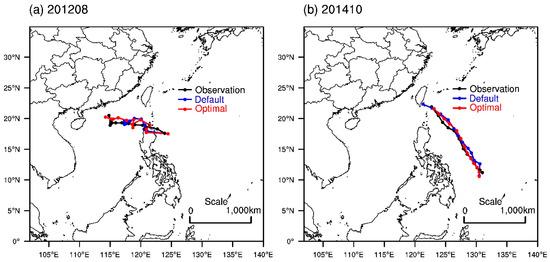 Track of typhoons for (a) Vicente (201208) and (b) Matmo (201410) simulated with the default and optimal scheme combination for the track simulations.