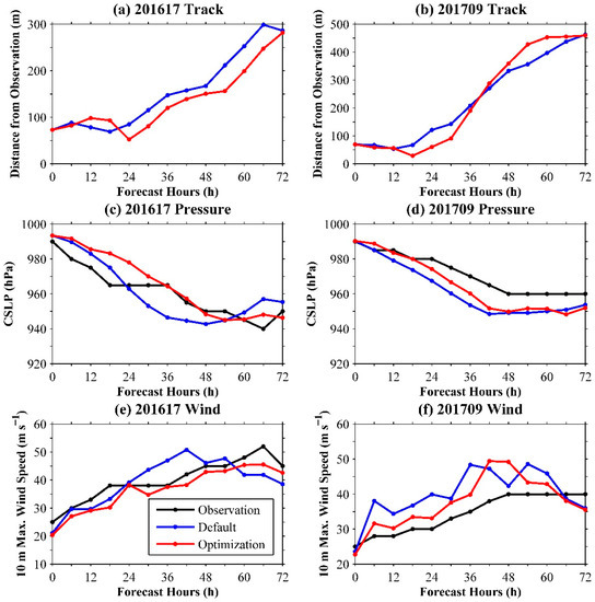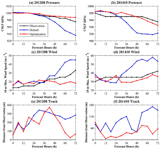 The comparisons of track simulations using the default and optimal scheme combinations were also conducted. The results are shown in Figure 9e–f. The track simulations for typhoons Vicente (201208) and Matmo (201410) demonstrated that the default simulation error had a significantly ascending trend after the 24th h. The optimal simulation for typhoon Vicente (201208) decreased the track simulation error after 24 h, and the optimal simulation for typhoon Matmo (201410) always had a low error compared to the default simulation. The track conclusions could explain the reasonability of the previous CSLP and wind simulations. Overall, these large error reductions further demonstrated that the optimal scheme combination was more suitable for the typhoon simulations than the default scheme combination.