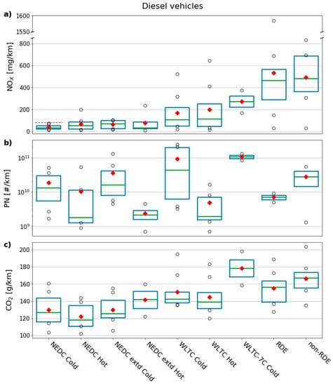 Boxplot of emission factors of the diesel sample for complete tests (a) NOX [mg/km], (b) particle number (PN) [#/km], and (c) CO2 [g/km]. The box represents the 1st and 3rd quartile, the green line is the median, the red diamond is the mean, and the black circles are data points beyond the interquartile range. In (a) the brown dashed line represents the Euro 6 emission limit at type approval for diesel vehicles over the NEDC cold test [80 mg/km] (PN limit of 6 × 1011 #/km not displayed for readability). Note that in (a) the y-axis is broken in two sections, and in (b) y-axis is logarithmic.