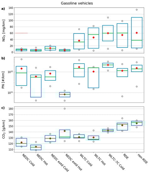 Boxplot of emission factors of the gasoline sample for complete tests (a) NOX [mg/km], (b) PN [#/km], and (c) CO2 [g/km]. The box represents the 1st and 3rd quartile, the green line is the median, the red diamond is the mean, and the black circles are data points beyond the interquartile range. In the (a), the brown dashed line represents the Euro 6 emission limit at type approval for gasoline vehicles over the NEDC cold test [60 mg/km] (PN provisional limit of 6 × 1012 #/km applicable for GDIs of this study not displayed for readability). Note that in (b) y-axis is logarithmic.