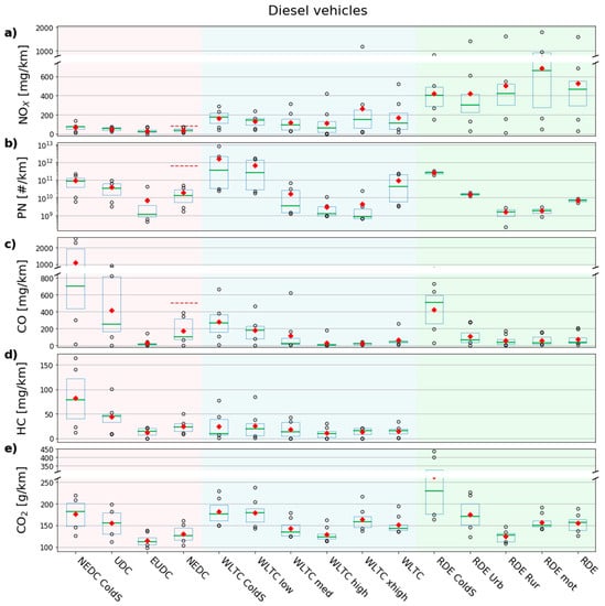 Boxplot of emission factors of the diesel sample for NEDC, WLTC, and RDE phases and their respective cold start (a) NOX [mg/km], (b) PN [#/km], (c) CO [mg/km], (d) total hydrocarbons (HC) [mg/km], and (e) CO2 [g/km]. The box represents the 1st and 3rd quartile, the green line is the median, the red diamond is the mean, and the black circles are data points beyond the interquartile range. The brown dashed lines represent the Euro 6 emission limit at type approval for diesel vehicles over the NEDC cold test for NOX [80 mg/km], PN [6 × 1011#/km], and CO [500 mg/km]. Note that in (a), (c), and (e) the y-axis is broken in two sections and in (b) y-axis it is logarithmic.