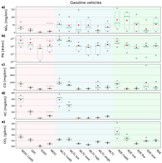 Boxplot of emission factors of the gasoline sample for NEDC, WLTC, and RDE phases and their respective cold start (a) NOX [mg/km], (b) PN [#/km], (c) CO [mg/km], (d) HC [mg/km], and (e) CO2 [g/km]. The box represents the 1st and 3rd quartile, the green line is the median, the red diamond is the mean, and the black circles are data points beyond the interquartile range. The brown dashed lines represent the Euro 6 emission limit at type approval for gasoline vehicles over the NEDC cold test for NOX [60 mg/km], PN [6 × 1012#/km applicable for GDIs of this study], CO [1000 mg/km], and HC [100 mg/km]. Note that in (b) y-axis is logarithmic.