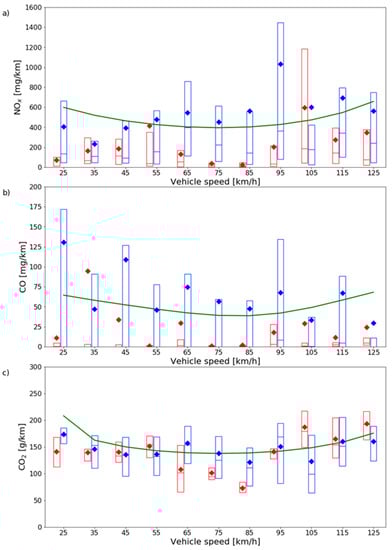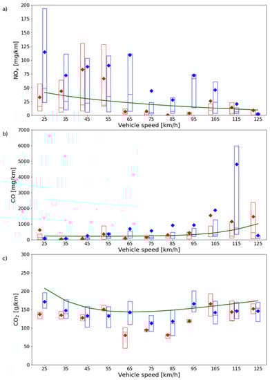 Distribution of diesel sample emissions as a function of speed over WLTC Hot (red boxes), RDE without first five minutes (blue boxes), and EFs retrieved from EMEP/EEA inventory guidebook (green line) for (a) NOX (b) CO, and (c) CO2. The box represents the 1st and 3rd quartile, the line inside the box is the median, and the diamond is the mean.