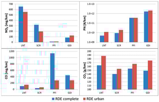 RDE emission results presented in Section 3 correspond to the average emissions measured over the two RDE-compliant routes per vehicle (at least one valid test on each route on every car). Similarly, non-RDE EFs correspond to the average of non-RDE compliant tests performed on each vehicle over the non-RDE compliant routes and the dynamic driving tests (maximum, one repetition per route).