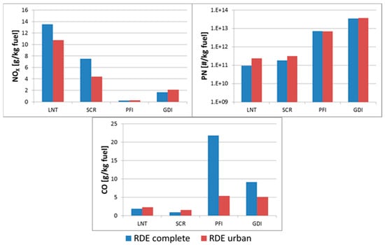 The NOX Not-To-Exceed (NTE) limit applicable for Euro 6d-TEMP vehicles at TA on RDE tests is 168 mg/km and 126 mg/km for diesel and gasoline vehicles, respectively, and it is applicable to the complete test and the urban section separately considered (EU Regulation 2017/1151); 61% of the tested vehicles (6 diesel vehicles and 2 gasolines) had NOX emissions above the NTE limits, demonstrating that the entry into force of the RDE regulation is an important challenge for vehicle manufacturers that will be required to improve the environmental performance of a large percentage of their fleets. The NTE limit for NOX will be further reduced from 2020 based on annual reviews of the conformity factor to account for the reduction of the measurement uncertainty of PEMS as compared to laboratory equipment. According to the last available review (EU Regulation 2018/1832), the limits will be 114.4 mg/km and 85.8 mg/km for diesel and gasoline vehicles, respectively. This NTE limit would only be met by three vehicles of the tested fleet D2, G4, and G5. All GDIs would fail the RDE test for their NOX emissions on the complete and/or urban sections which will require a better de-NOx strategy for Euro 6d-TEMP GDIs which are being quickly introduced in the European market due to its improved fuel economy as compared to PFIs [].