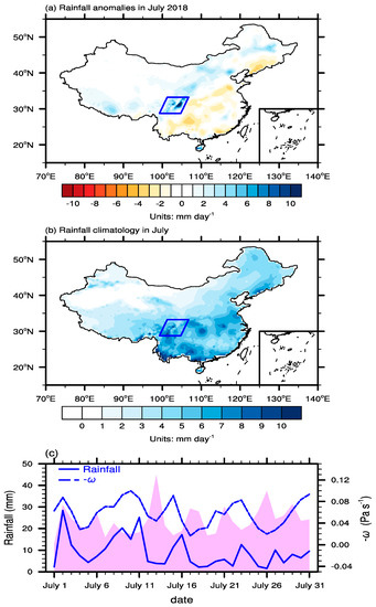 Summer is the primary rainy season for most parts of East Asia. The anomalous summertime rainfall often causes meteorological hazards such as floods and droughts, exerting profound influences on society [1,2]. For example, excessive rainfall was observed over eastern China in the summer of 1998 [3], 2003 [4], and 2007 [5], leading to severe floods, causalities, and economic losses. In the summer of 2018, the country-mean rainfall in China reached 356.4 mm, which is 9.6% more than the climatology and is the highest level during the past 20 years [6]. The excessive rainfall was mainly observed in Northwest China, North China, Northeast China, Southwest China, and the southeastern coast of China, accompanied by many floods and city waterlogging [6]. From the viewpoint of the summer mean, the characteristics and causes of this unusual rainy season have been analyzed thoroughly with an emphasis on the eastern and northern parts of China [6,7,8]. In contrast, the causes of excessive rainfall in Southwest China has not been explained. Moreover, it is noteworthy that the East Asian summer rainfall shows evident sub-seasonal variations [1]. It means that it is necessary to investigate and understand the anomalous summer rainfall and the resultant hazards from the sub-seasonal timescale. For example, several record-breaking rainfalls were observed in Southwest China surrounding the Sichuan Basin in July of 2018 [9,10], leading to floods in several major tributaries of the Yangtze River including the Min River, Tuo River, and Jialing River, and landslide and debris flow in parts of Sichuan and Gansu Provinces [9,10]. Hence, it is meaningful to understand the causes of the flood in Southwest China from a sub-seasonal perspective.