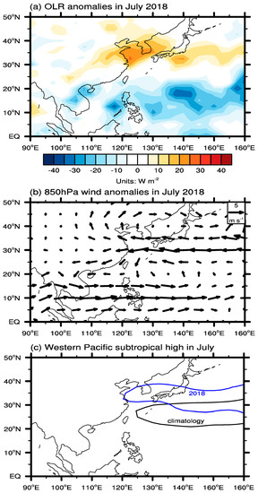 The anomalies of (a) outgoing longwave radiation (OLR; SI = 5 W m−2) and (b) 850 hPa winds in July 2018 (unit: m s−1); (c) the location of the western Pacific subtropical high (indicated by the 5880 gpm counter) in July for the climatology (black) and the year 2018 (blue).