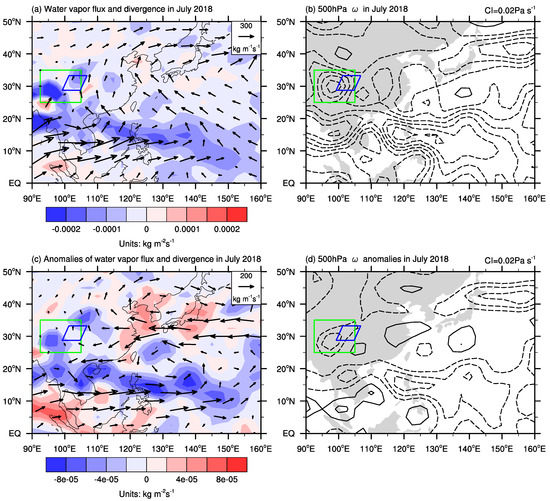 The (a) column-integrated water vapor flux (vector, unit: kg m−1 s−1) and its divergence (shading, SI = 5 × 10−4 kg m−2 s−1) and (b) the 500 hPa omega [contour interval (CI) = 0.02 Pa s−1] in July 2018; (c,d) are the same as (a,b), but for the anomalies in July 2018. The blue parallelograms are the same as those in Figure 1a,b. The green rectangles indicate the region to calculate the omega in Figure 1c.